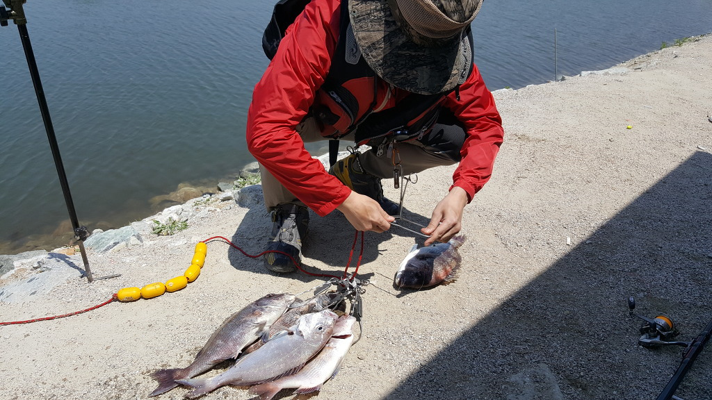 방류 직후부터 1시까지 친구가 잡아 낸 참돔입니다.